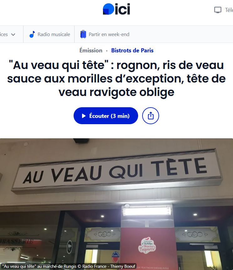 Les 16/03/2025 et 26/03/2025 – ICI Paris a réalisé le 16 mars une chronique sur le restaurant mythique du Marché de Rungis Au Veau qui Tête : “Au veau qui tête » : rognon, ris de veau sauce aux morilles d’exception, tête de veau ravigote oblige.