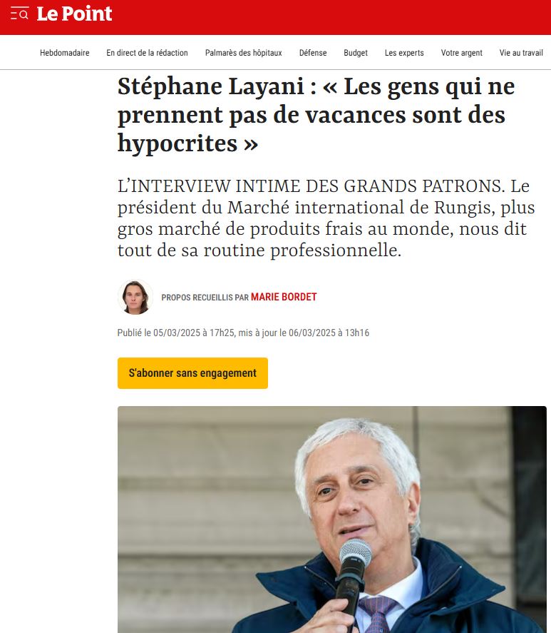 Plus d’infos ici : https://www.lepoint.fr/economie/stephane-layani-president-de-rungis-les-gens-qui-ne-prennent-pas-de-vacances-sont-des-hypocrites-05-03-2025-2584006_28.php#11