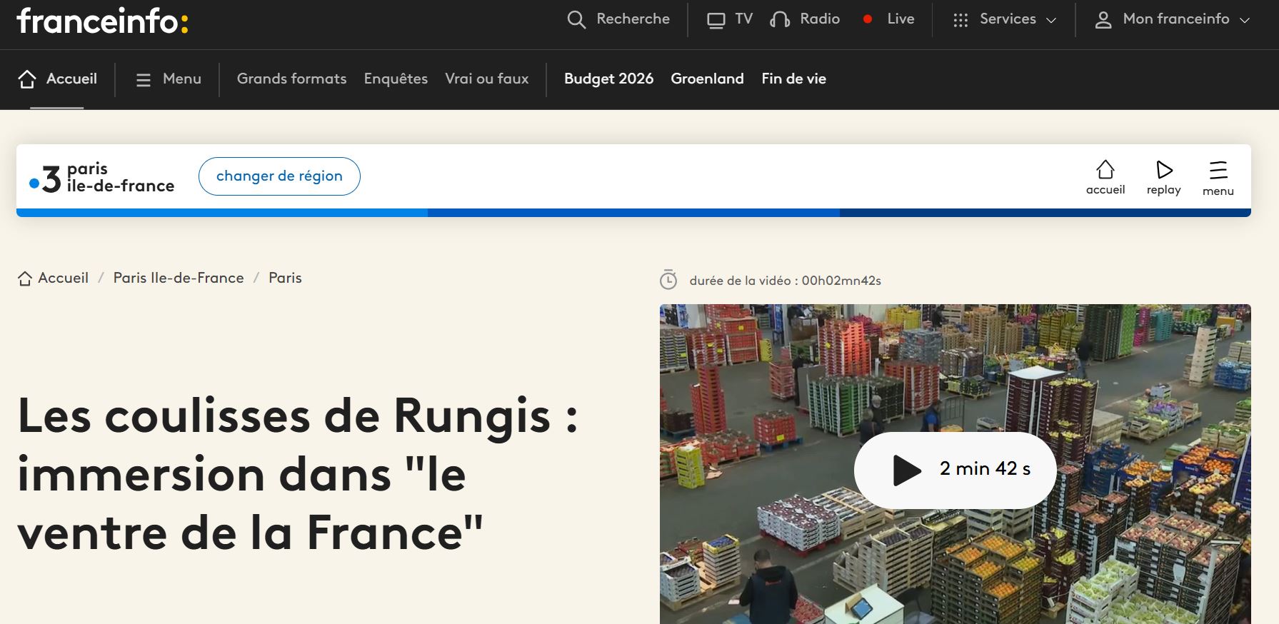 Le 09/03/2025 – France 3 Paris Île-de-France a diffusé une série de reportages intitulée Les coulisses de Rungis, consacrée au quotidien du Marché international de Rungis, surnommé « le ventre de la France ».