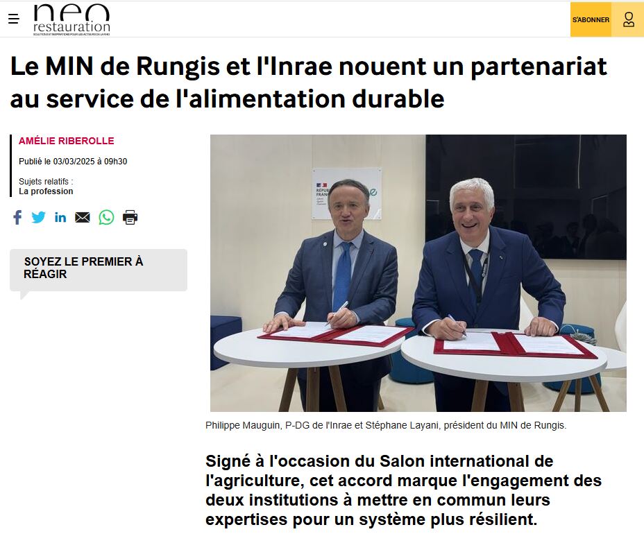 Le 03/03/2025 – Inside Cookorico, Neo Restauration et 94citoyens ont publié un article sur le partenariat entre le Marché de Rungis et l’Inrae, officialisée lors du Salon International de l’Agriculture. Stéphane Layani, président du Marché international de Rungis, y voit une opportunité de faire de Rungis un véritable laboratoire de l’alimentation durable.